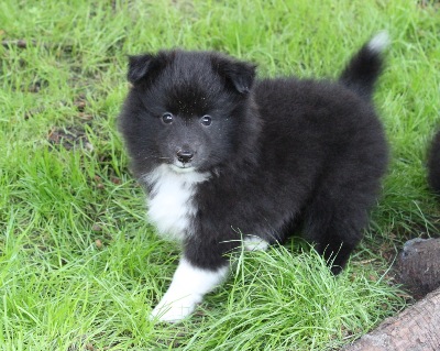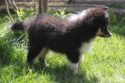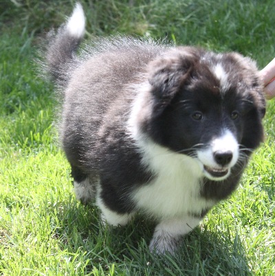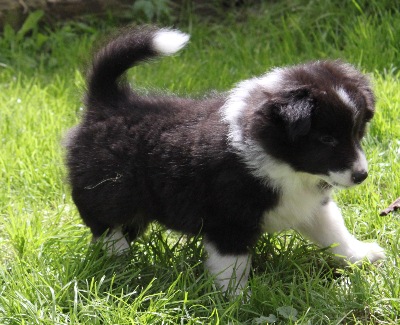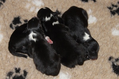 Es sind eine Hündin schwarz-weiß, zwei Rüden schwarz-weiß und ein Rüde tricolour.