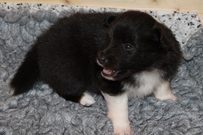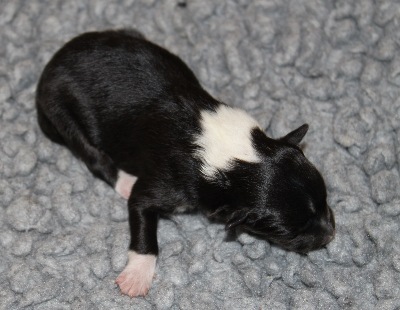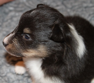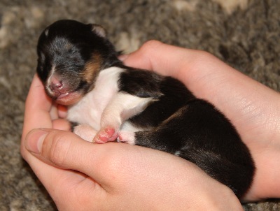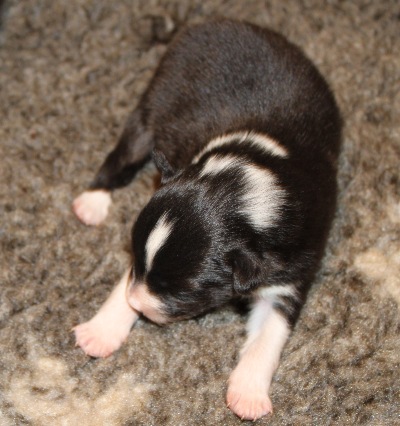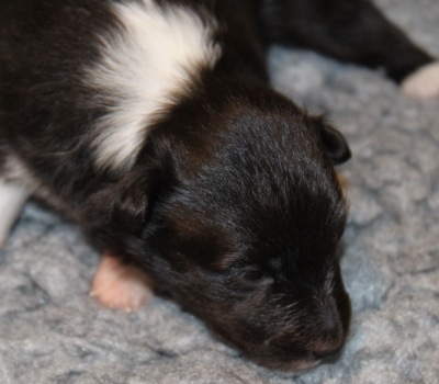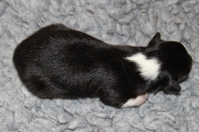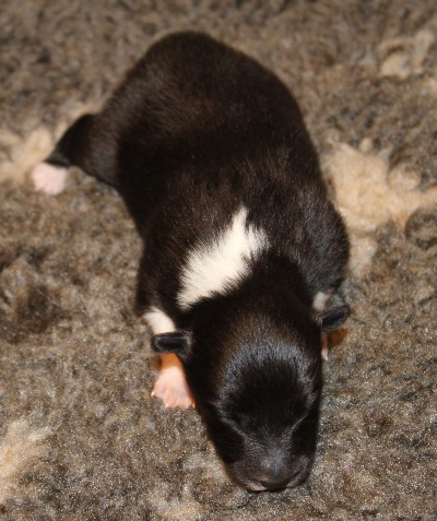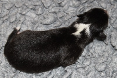 Blackburn (768g). Er ist immer noch der größte Welpe im Wurf. Er hatte als Erster vor drei Tagen seine Augen geöffnet.